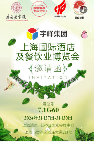 宇峰集團上海國際酒店及餐飲業博覽會,展位:7.1G60,參展時間2024年3月27日—3月30日,上海國際會展中心我們等您哦!