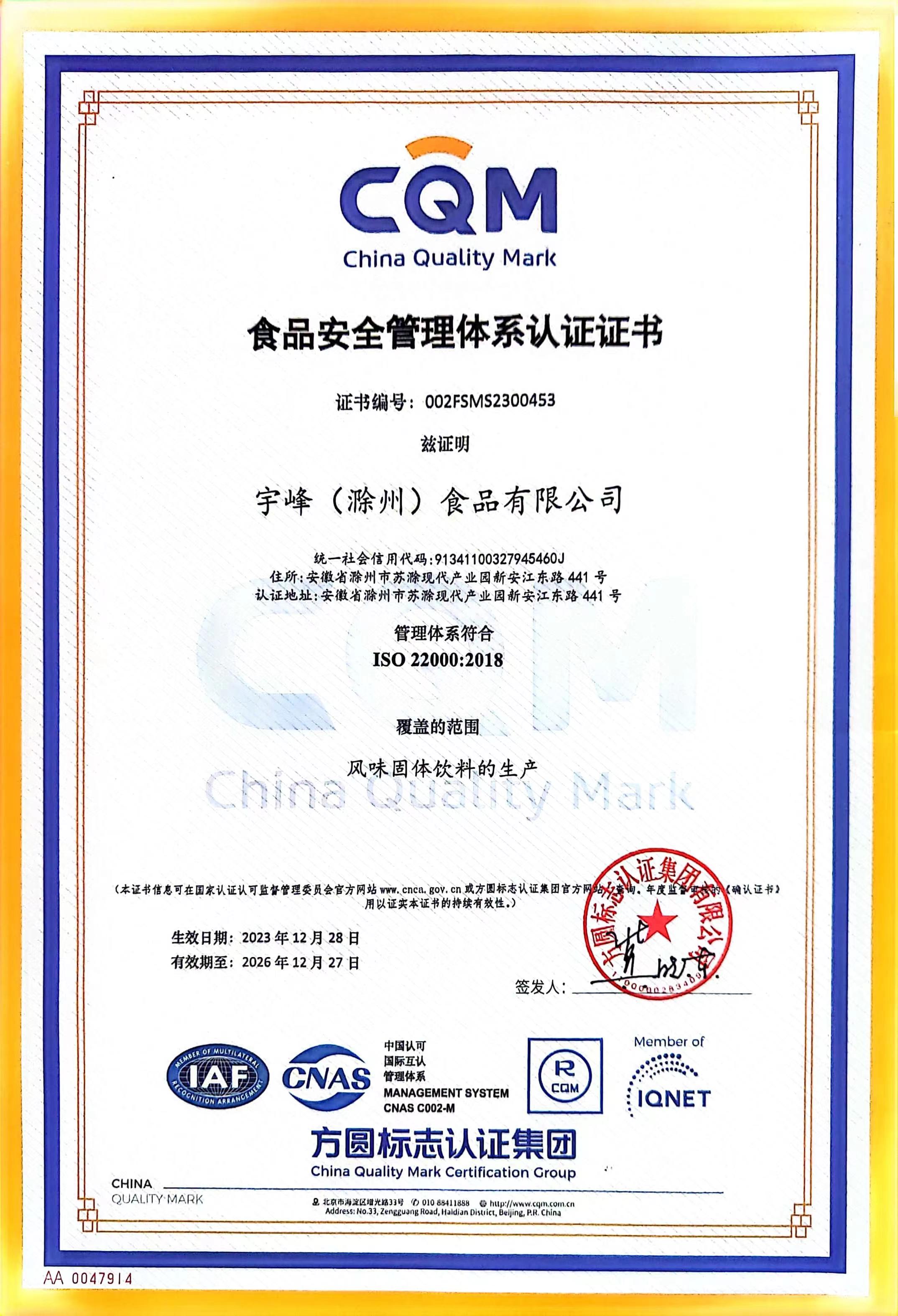 食品安全管理體系認證證書